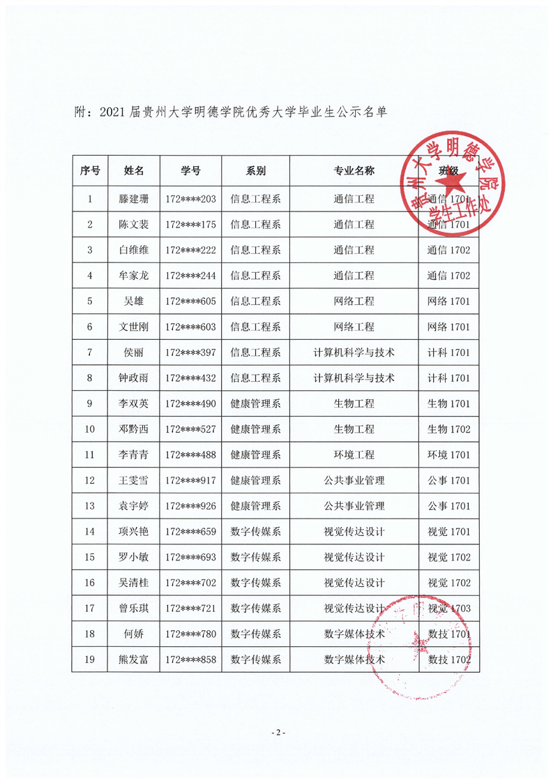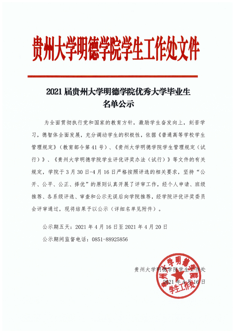 贵州大学明德学院关于2021届贵州省普通高等学校优秀毕业生评选推荐结果的公示