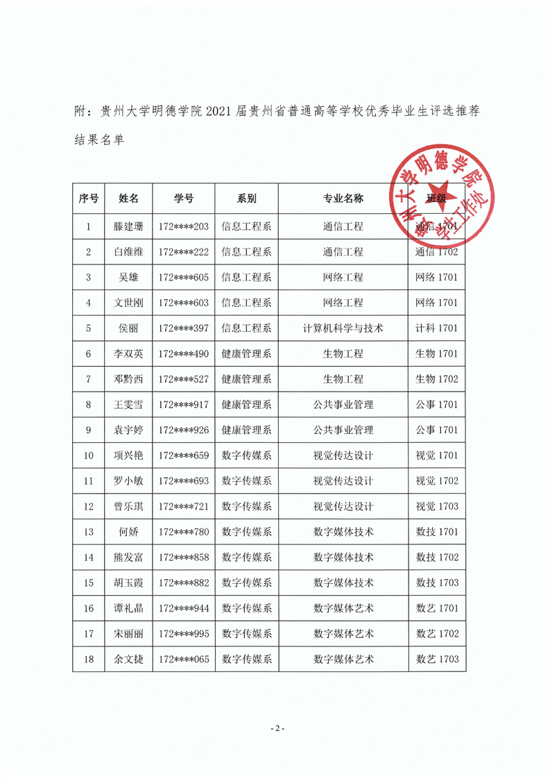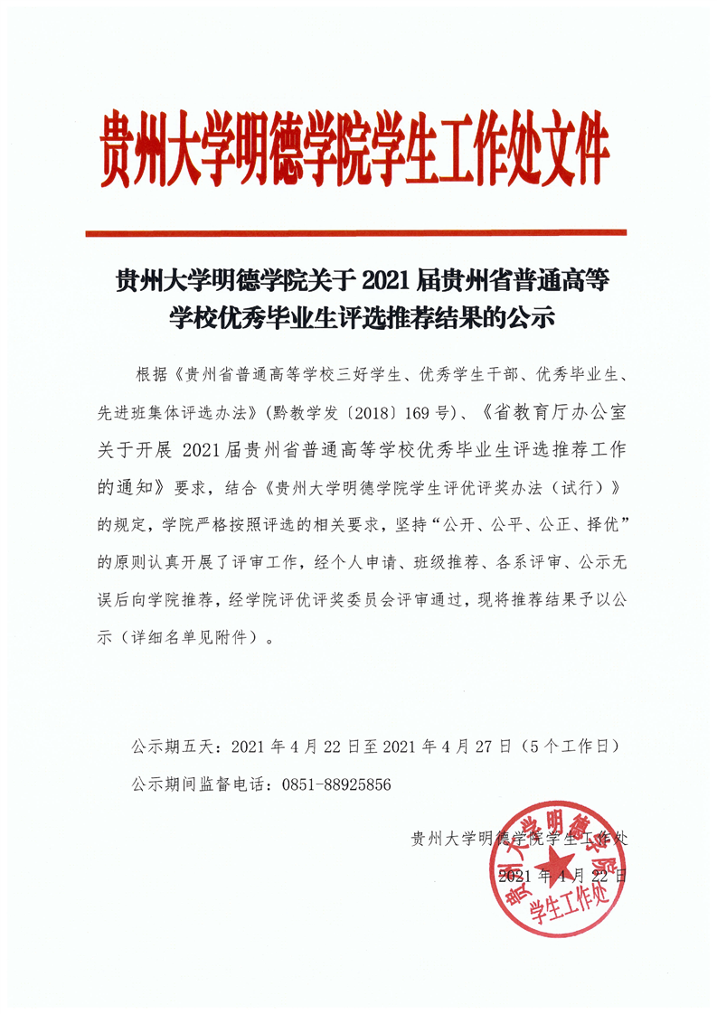 贵州大学明德学院关于2021届贵州省普通高等学校优秀毕业生评选推荐结果的公示
