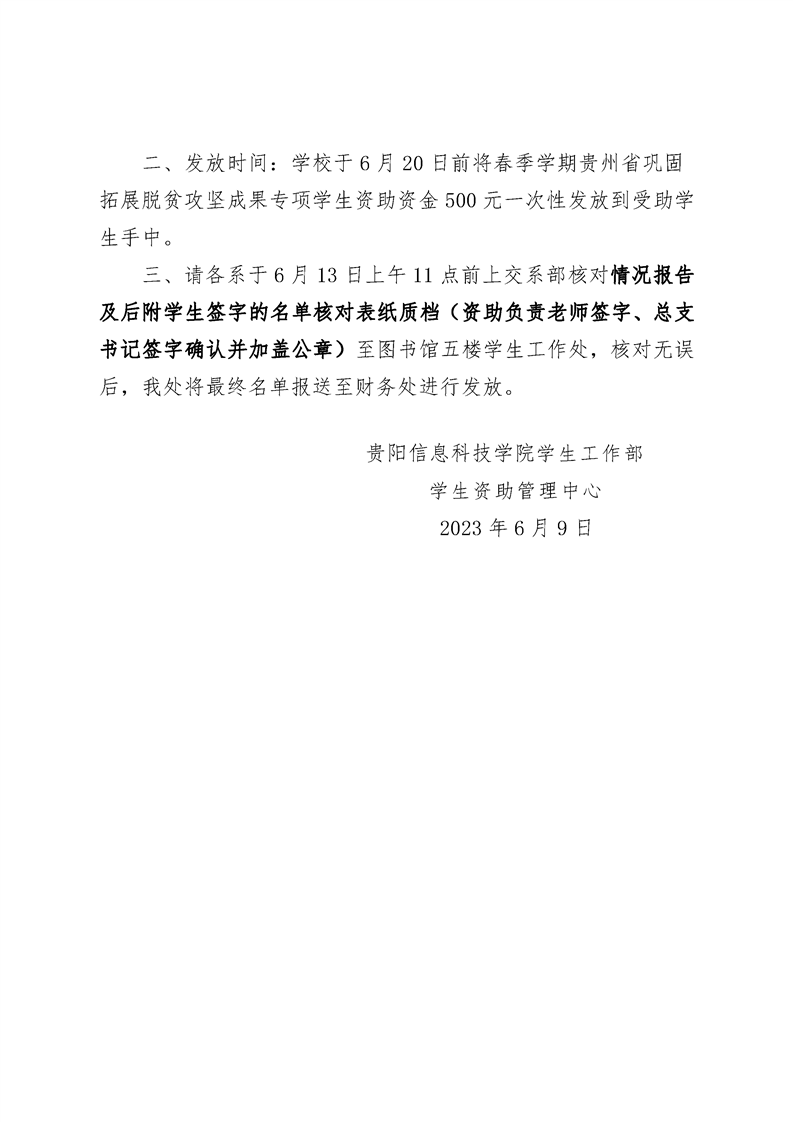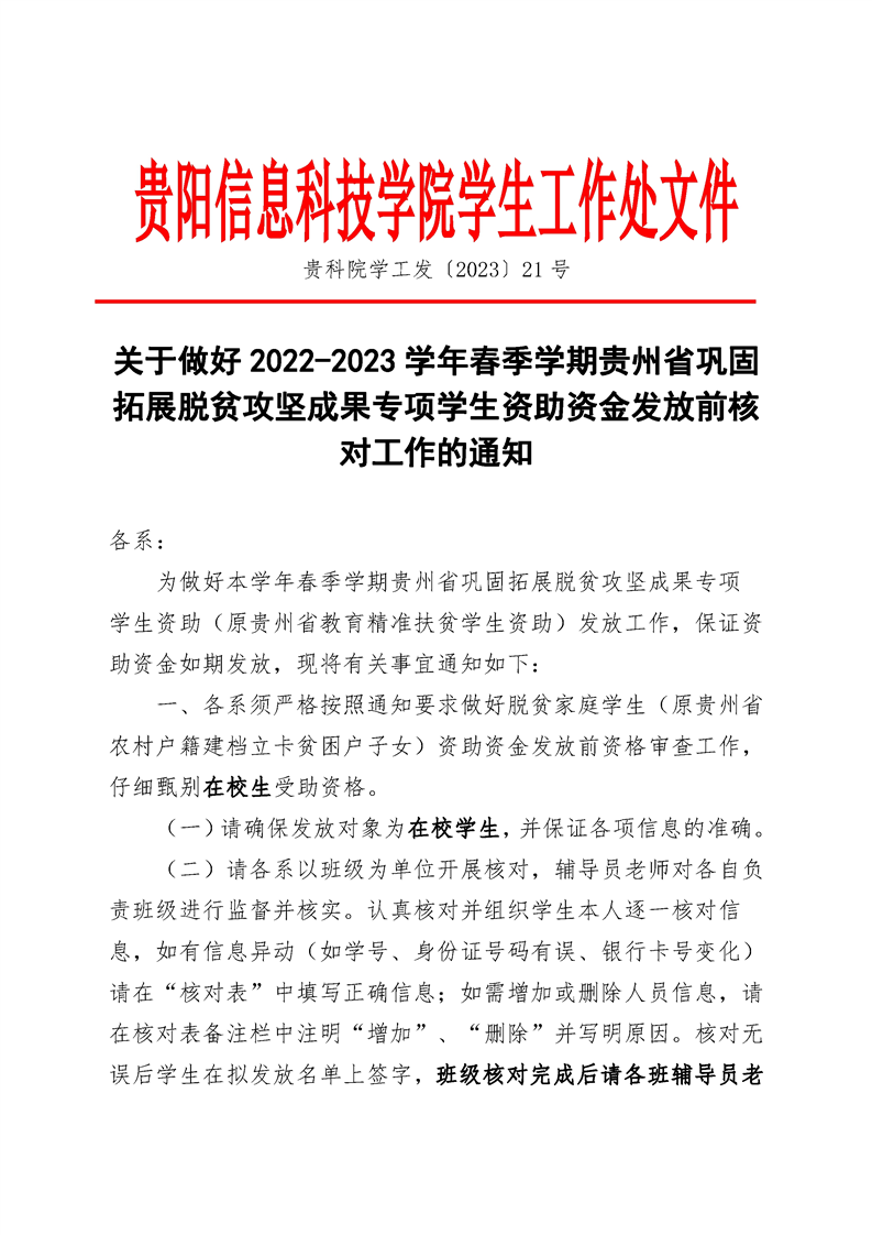 关于做好2022-2023学年春季学期贵州省巩固拓展脱贫攻坚成果专项学生资助资金发放前核对工作的通知