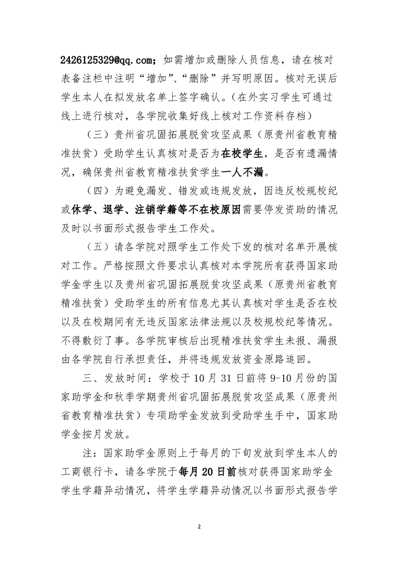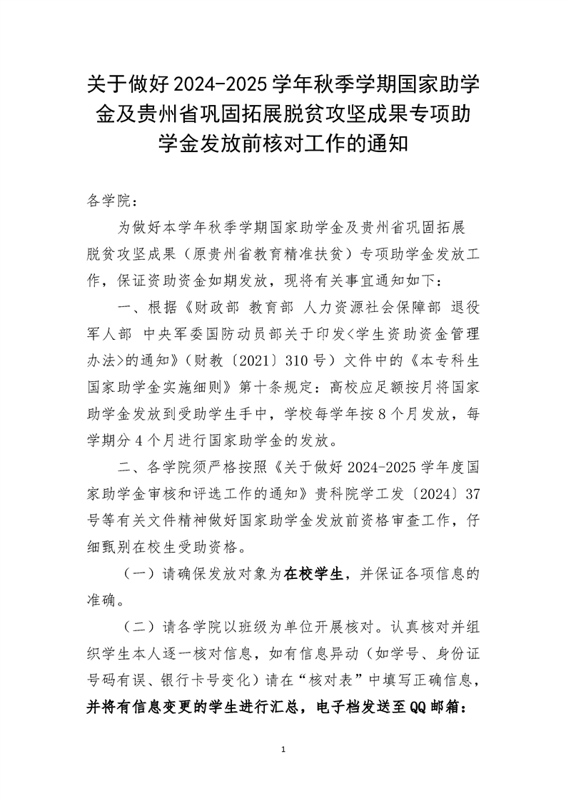 关于做好2024-2025学年秋季学期国家助学金及贵州省巩固拓展脱贫攻坚成果专项助学金发放前核对工作的通知