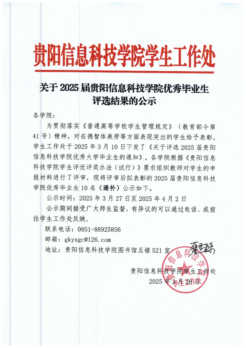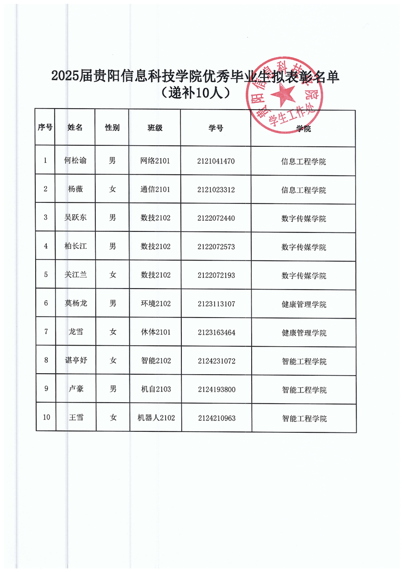 2025届BV伟德中国官方网站优秀毕业生表彰的10名学生(递补)公示