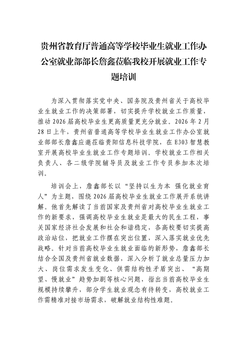 贵州省教育厅普通高等学校毕业生就业工作办公室就业部部长詹鑫莅临伟德官网开展就业工作专题培训