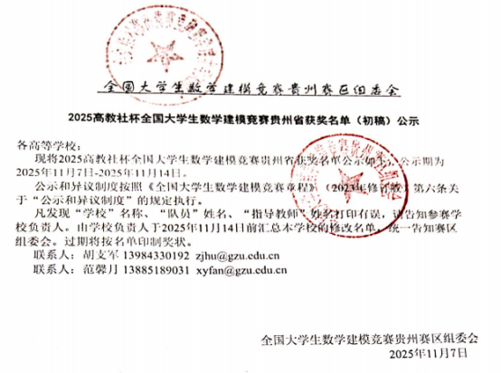近日,由中国工业与应用数学学会联合主办的2025年“高教社杯”全国大学生数学建模竞赛成绩揭晓。伟德官网共三名教师及指导队伍获奖,分别是公共教学部惠芸老师指导的学生队伍胡嵩凌、龙一、陈港三名同学荣获贵州赛区二等奖;公共教学部王孟孟老师指导的学生队伍吴江灿、吴琼、黄贵琴三名同学荣获贵州赛区三等奖;智能工程学院张宁老师指导的学生队伍陈蝶、严琴、车方鑫三名同学荣获贵州赛区三等奖的好成绩。