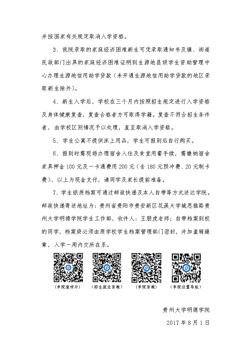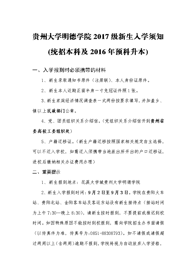 贵州大学明德学院2017级新生入学须知(统招本科及2016年预科升本).docx